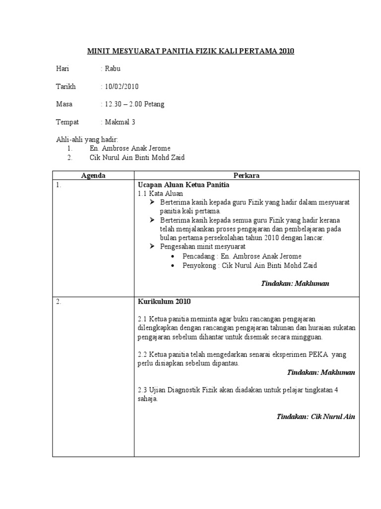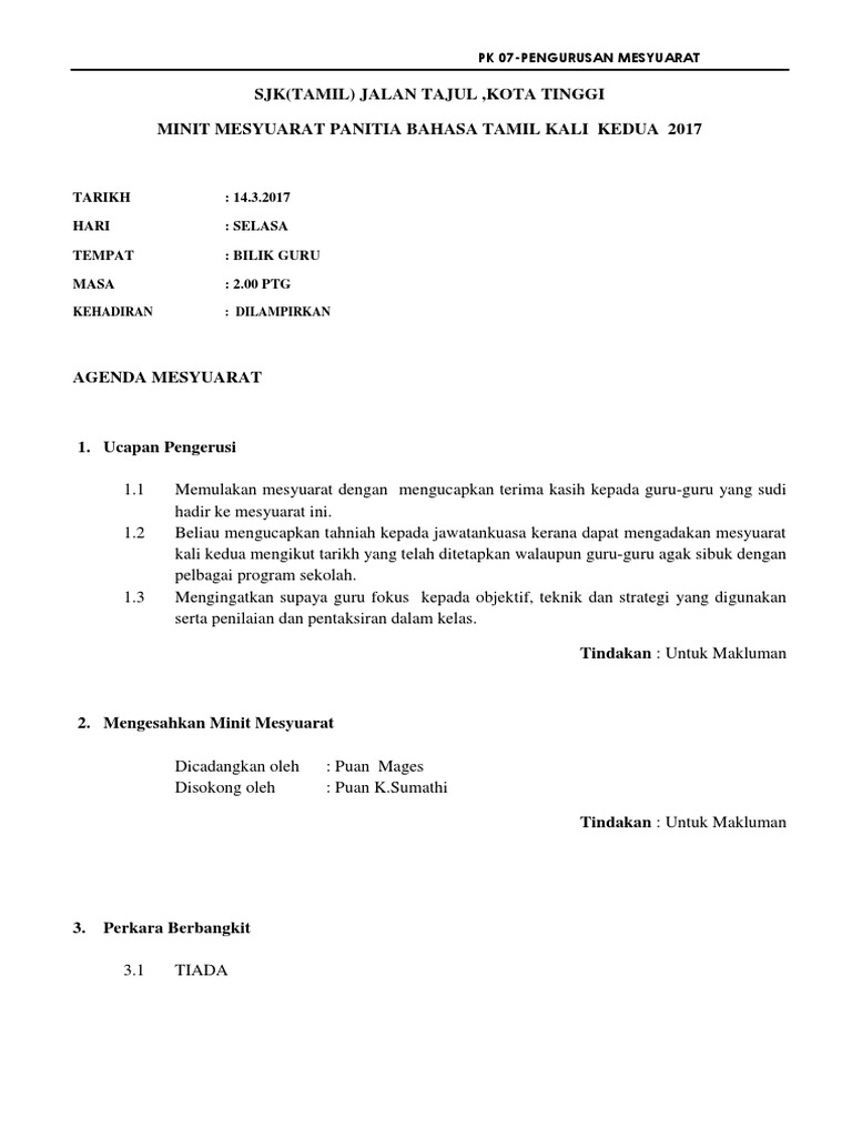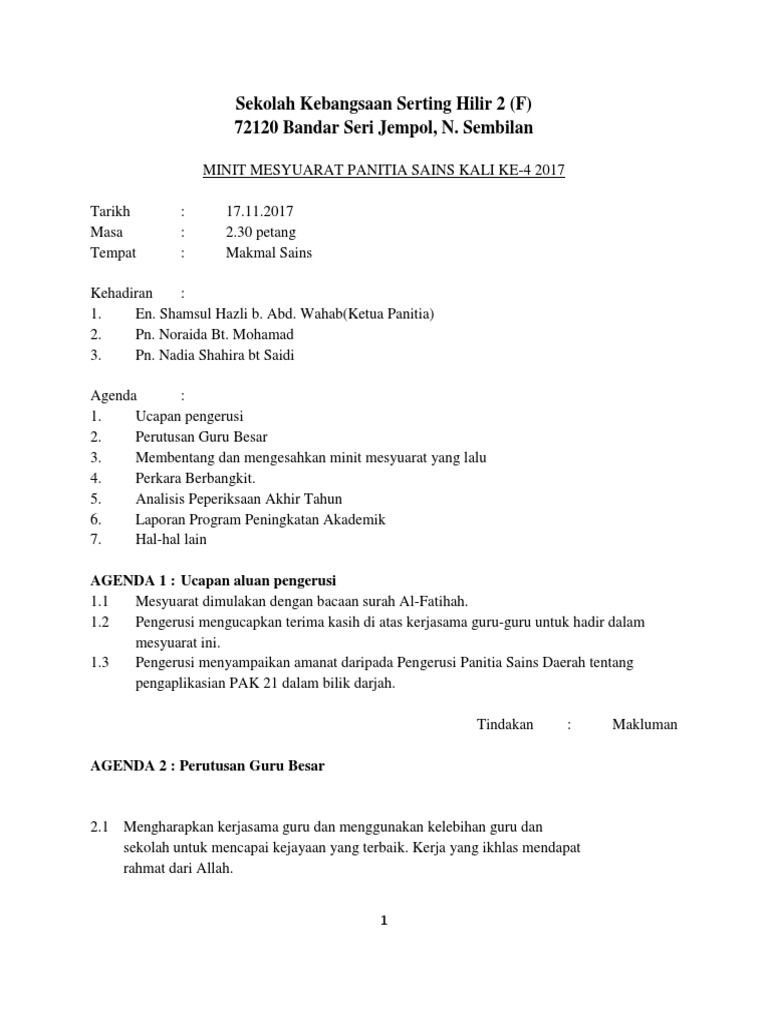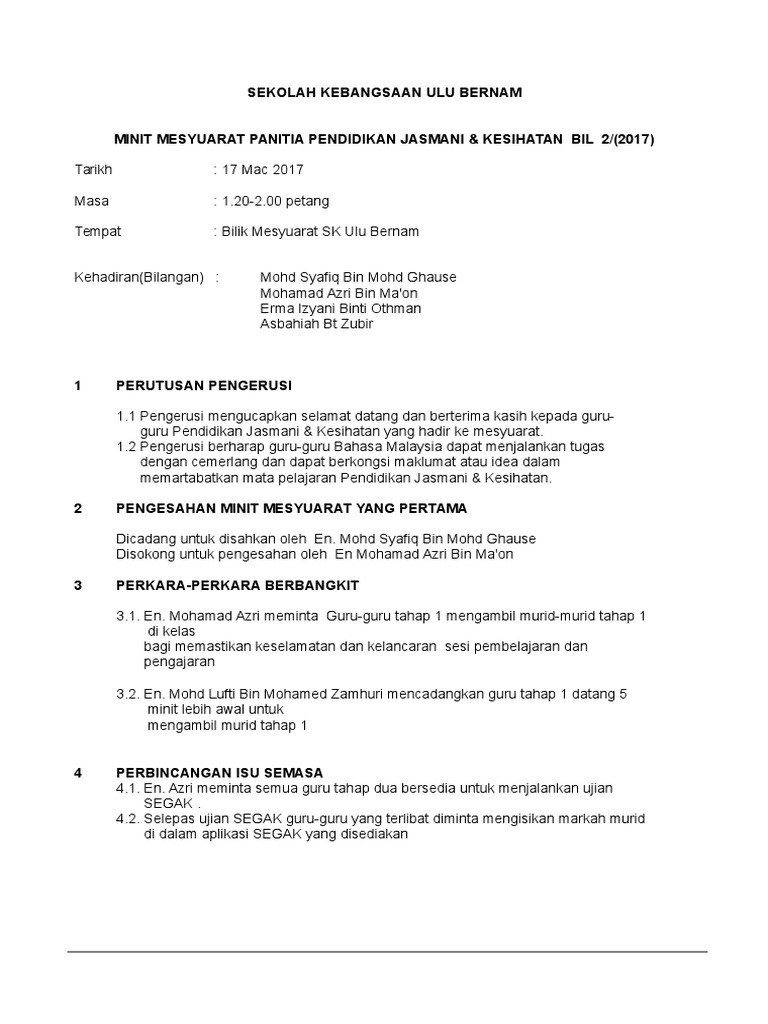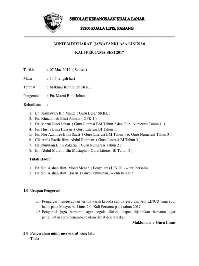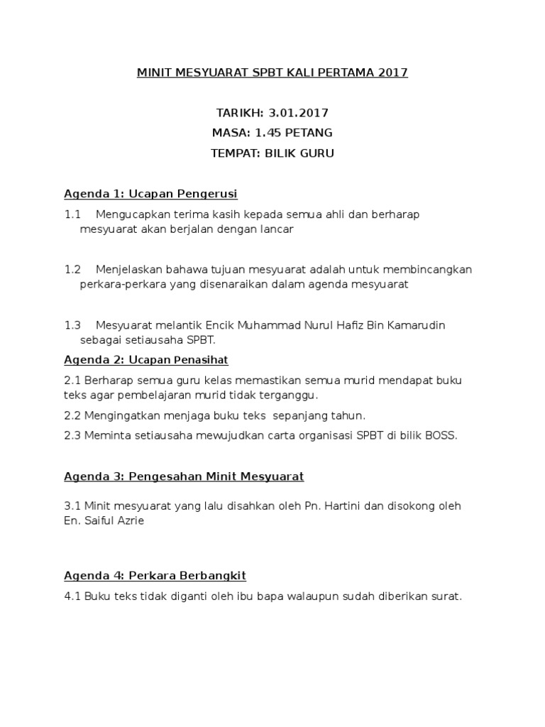 Minit Mesyuarat Spbt Kali Pertama 2017 : Sekian sahaja perkongsian kami dalam posting kali ini.. 3.1 mesyuarat bersetuju dengan perlantikan jawatankuasa murid seperti berikut: Minit mesyuarat kali pertama kebersihan, keceriaan dan keselamatan keselamatan (3k) sekolah kebangsaan sungai jernih 34510 batu kurau perak bil. (muhammad nurul hafiz bin kamarudin) (azizee bin alli ahmad) setiausaha spbt guru besar sk ulu sungai siong sk ulu. 100%(3)100% found this document useful (3 votes). Mesyuarat jpms kali pertama tahun 2017.