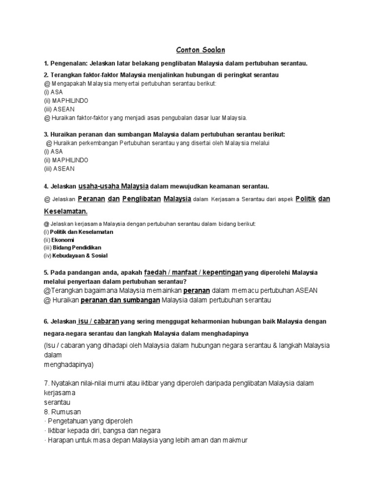 Latihan Pengukuhan Dan Jawapan from imgv2-2-f.scribdassets.com § peranan yang dimainkan oleh malaysia malaysia memainkan peranan yang cergas dalam aktiviti oic, misalnya § sumbangan oic kepada malaysia. Tujuannya komunitas keamanan asean adalah untuk menanggulangi tindak kejahatan dan juga kekerasan. Peranan dan sumbangan malaysia sebagai anggota asean • menandatangani deklerasi kuala lumpur pada november 1971. Calon hendaklah menjawab berdasarkan kerangka jawapan di bawah ini. Disini indonesia mempunyai suatu peranan yang cukup penting pada perkembangan asean, karena indonesia alah salah satu penentu arah perkembangan. Peranan dan sumbangan malaysia dalam asean. Sumbangan beliau di dalam menbangunkan dasar dan industri pendidikan tinggi di malaysia tidak dapat disangkal lagi, khususnya untuk kemajuan masyarakat melayu. Sepanjang perang dingin dan hingga akhir perang dingin pada tahun 1990, kerjasama negara anggota asean lebih intensif dilakukan dalam skala bilateral yang menaruh perhatian pada keamanan domestik, seperti patroli perbatasan, pertukaran pandangan mengenai perkembangan strategi, dan.